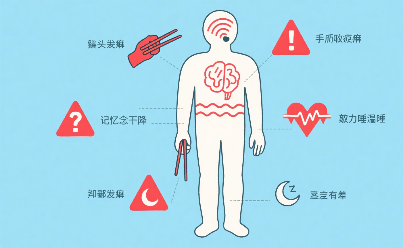 •手脚发麻,握笔、拿筷子时感觉无力;