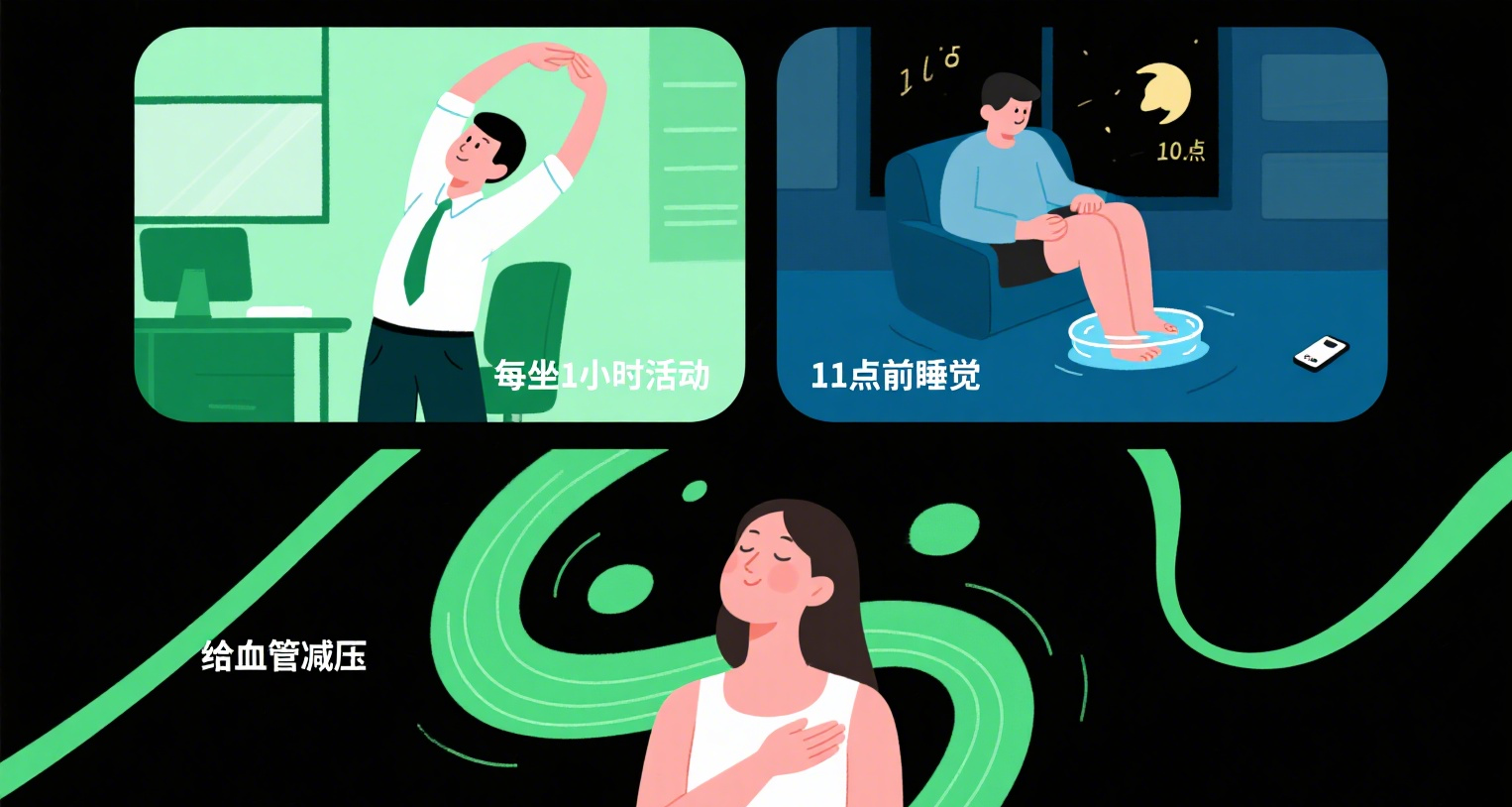 给睡眠 “设闹钟”:晚上 11 点前必须睡觉,睡前1小时远离手机,用热水泡脚10分钟,帮身体进入休息状态。睡够7-8小时,血管才能在夜间好好“修复”。