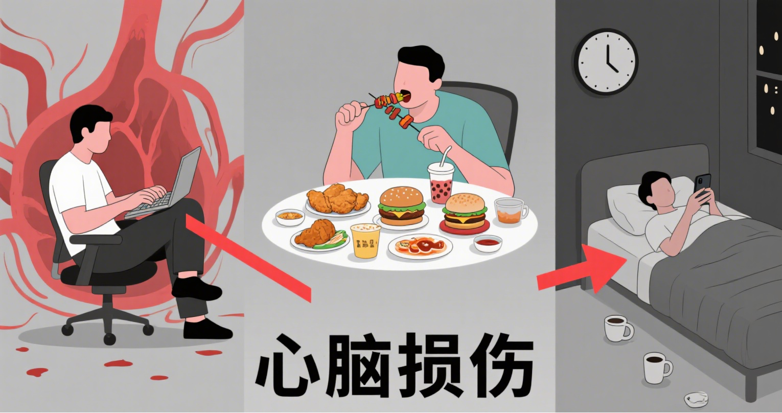 饮食 “踩雷”:顿顿高盐高油、奶茶烧烤不离口,还常常暴饮暴食。高盐让血管像被腌渍的咸菜,逐渐失去弹性;高油则让血液变得黏稠,就像混了泥沙的水流,流动越来越费力。