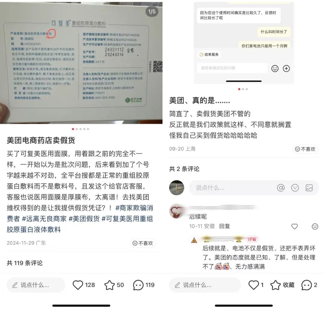 在社交平台上,不乏用户对美团电商业务的吐槽。有用户投诉在美团购买商品后,退货需要自己跟店家沟通,大件商品的退货尤为困难;