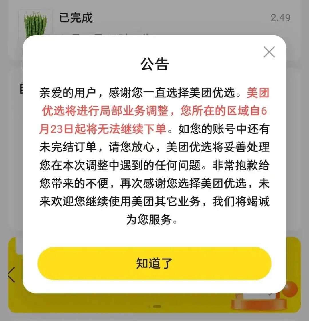 不过,结局似乎并不尽如人意。2025年6月,美团优选多地暂停接单,仅剩下广州、杭州等核心城市,随着“团好货”业务的暂停,如今广州、杭州站点的业务也已宣布关停。