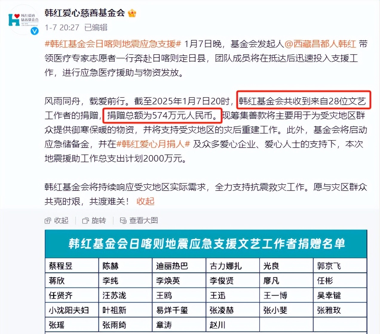 话说,1月7号,西藏那场6.8级地震,真是让人心疼。地震发生后,咱们的子弟兵立马就冲到前线救人,那速度,杠杠的!各行各业也纷纷伸出援手,韩红老师更是第一时间公布了28位明星的捐款名单,总共574万。听起来不少,可细算下来,平均每位明星才捐20万,这跟他们平时动辄几百万、上千万的片酬比起来,是不是有点……怎么说呢,有点不够看?