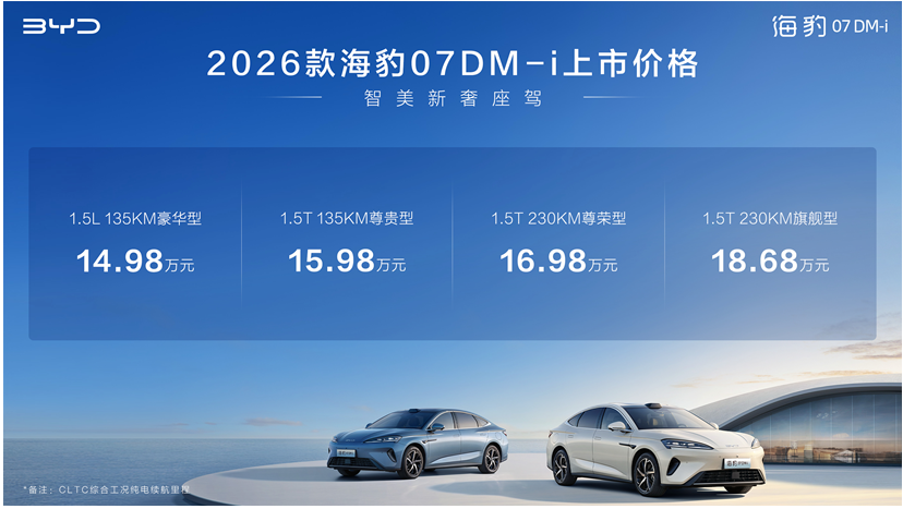 2026款海豹07DM-i以多维产品力进阶,精准满足用户对中大型轿车高品质出行的核心需求。并凭借不断升级的第五代DM技术、领先同级的辅助驾驶以及超百项全系标配等越级配置,将豪华车型的高端配置全面下探至主流市场,以“技术平权”重塑中大型轿车市场价值标准,刷新中大型轿车同级价值标杆,引领出行新体验。目前,新车已全面到店,欢迎感兴趣的用户通过比亚迪APP了解详情或到比亚迪海洋网各大门店品鉴试驾。