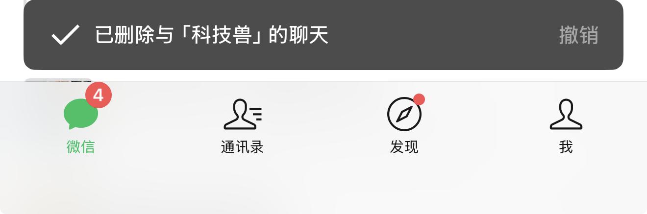 误删聊天记录可撤销另一个实用的新特性:聊天记录误删的撤销操作,现在也正式上线。当我们在微信中左滑删除单个好友或群聊对话时,界面底部会弹出一个「撤销」按钮,可以在 5 秒内撤销删除操作。有效解决了因误操作误删重要聊天记录的困扰。