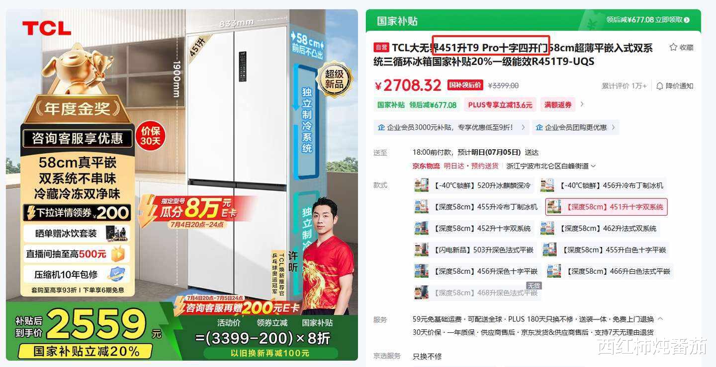 比如TCL在 24年发布的 T9 Pro,就分十字对开门和法式四门两个版本,容量分别为 451L和 462L,到手价稍有差异,但都控制在 3000元以内 ▲