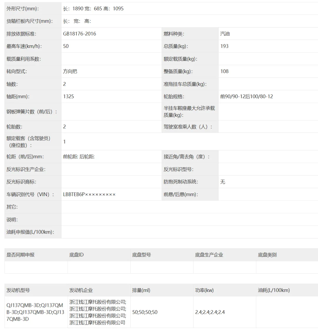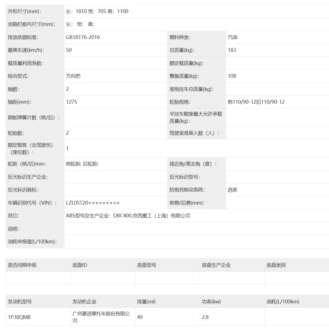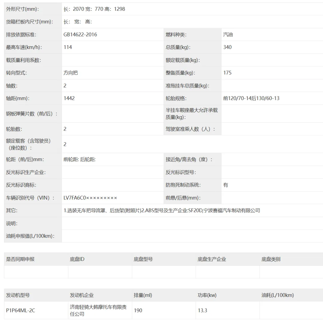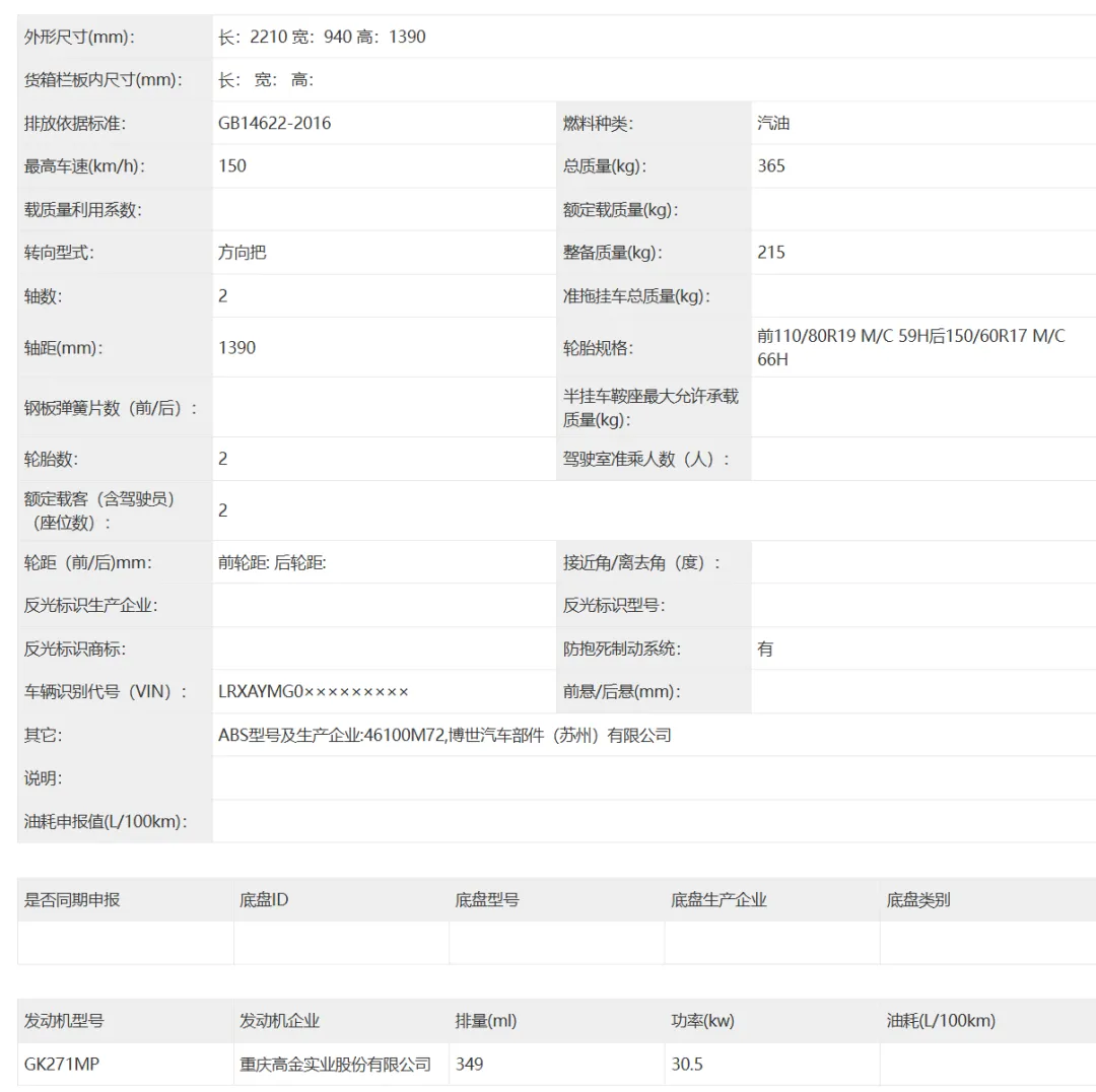 整备质量为229KG,注意的是登记的图片为三箱版本,所以是裸车版本的625X重量应该非常轻,符合凯越的轻量化的特点!