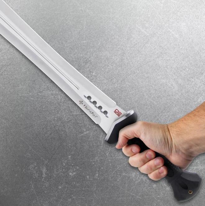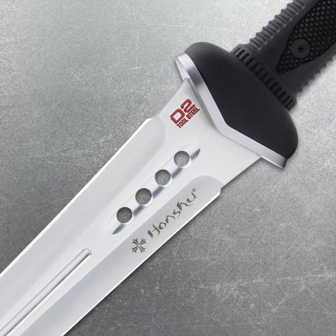 剑柄位置上刻有生产商的标识,这一标识不仅仅是一个简单的商品标记,更像是一种荣誉的象征,代表着制造商对于这把剑品质的自信和保证。这把剑的剑身采用的制造材料为优质 D2 钢,这种钢材以其出色的性能而闻名。在制造出剑身之后,又历经了一系列复杂而精细的处理工序。经过反复的打磨、淬火和回火等工艺,其自身的硬度最终可以稳定在 58hrc 左右。这使得剑身具备了极高的强度和耐磨性,能够在长时间的使用中保持足够的强度。