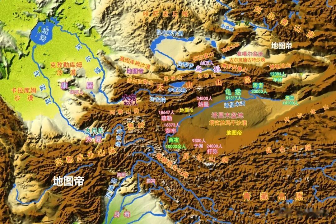古西域比今新疆大,有三十六国,或是四十八国,大致在天山南北和葱岭(帕米尔高原)东西。