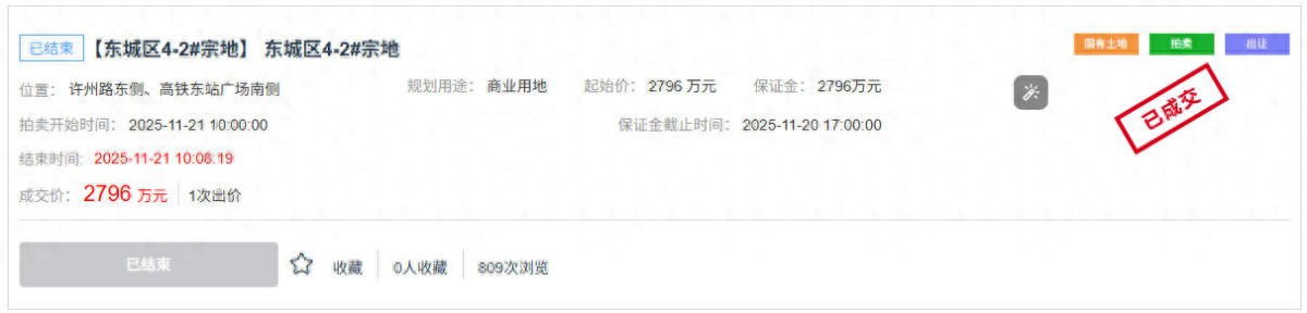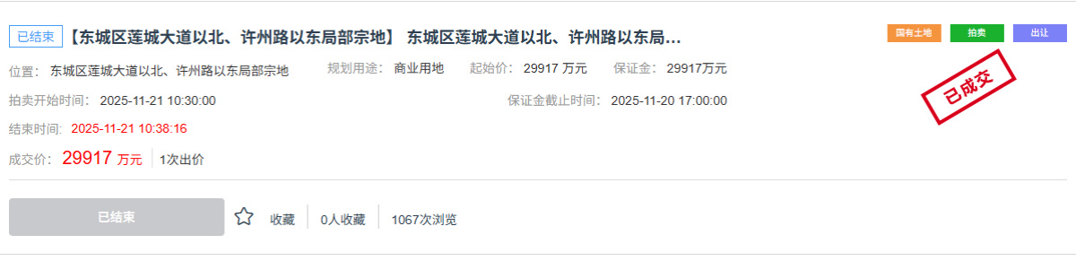 大河报·豫视频记者在河南省土地使用权网上交易看到,地块编号“东城区4-2#宗地”“东城区莲城大道以北、许州路以东局部宗地”分别以2796万元、29917万元成交,出价次数均为1次。
