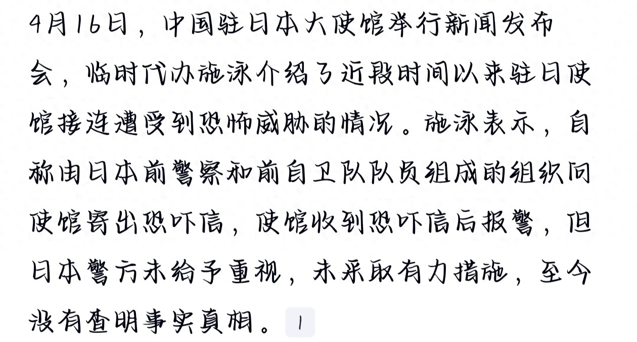 4月16日下午,中国驻日大使馆开了场发布会,临时代办施泳站出来披露了一件事——近段时间以来,使馆接连遭到恐怖威胁,密集得让人头皮发麻。