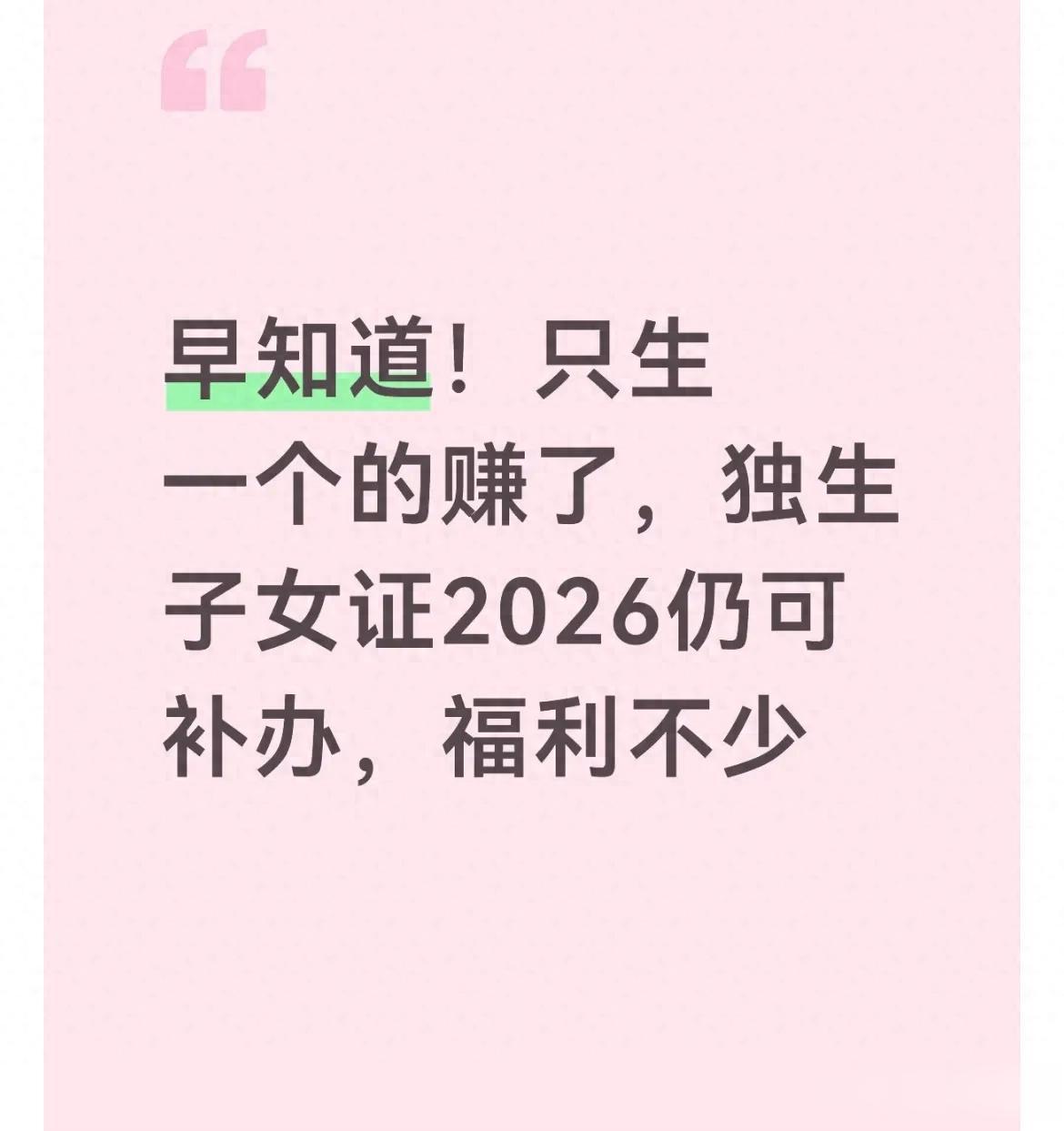 当年响应号召只生一个孩子的家庭,为人口调控作出了贡献,国家始终兑现承诺。2026年独生子女证效力不变、补办畅通、福利稳定,符合条件的家庭抓紧补办,让应得的保障落到实处。