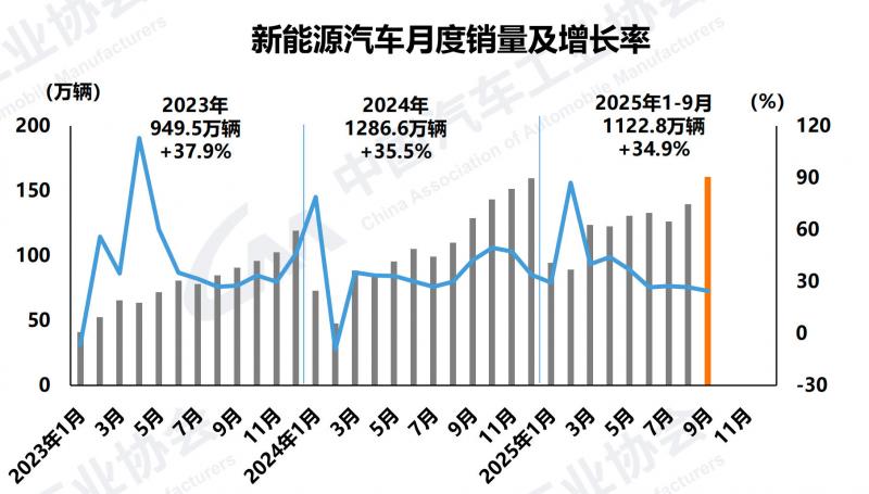 9月,新能源汽车产销分别完成161.7万辆和160.4万辆,环比分别增长16.3%和15%,同比分别增长23.7%和24.6%,新能源汽车新车销量达到汽车新车总销量的49.7%。