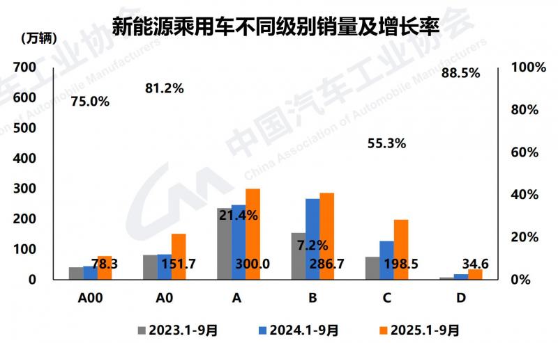 从车型级别来看,1-9月新能源乘用车中,各级别销量均呈不同程度增长,目前销量主要集中在A级和B级,累计销量分别为300.0万辆和286.7万辆,同比分别增长21.4%和7.2%。A0和A00级受政策拉动保持高速增长态势。