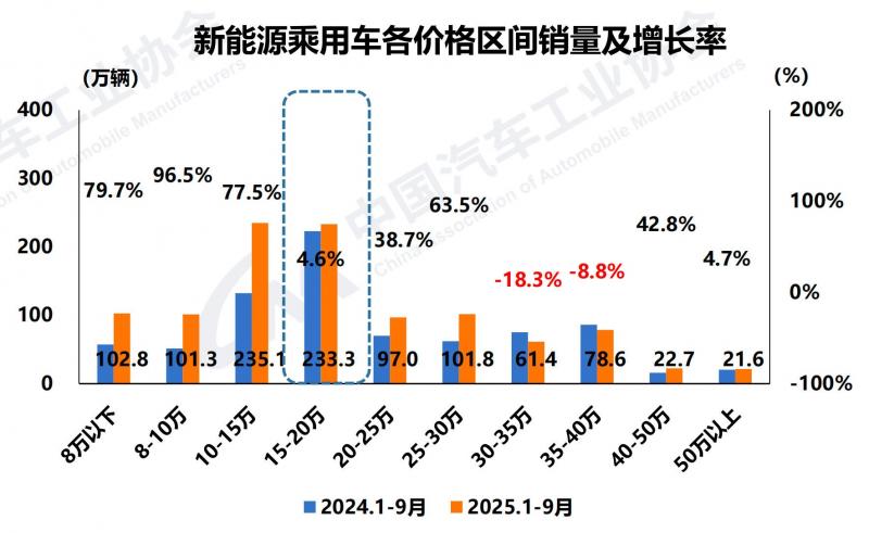 从价格区间来看,1-9月新能源乘用车中,30万-40万元价格区间销量同比下降,其他价格区间销量呈正增长。目前销量仍主要集中在10万-20万元价格区间,累计销量为468.4万辆,同比增长31.8%。