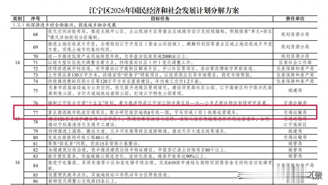 南京地铁8号线对生活在城东尤其是江宁麒麟附近的居民而言是一条极其重要的地铁线路,之前因为宁芜铁路改扩建导致一直没有被提上建设日程,如今这一问题已解决,所以地铁8号线的修建也就势在必行,因此南京地铁8号线有望被纳入地铁三期修建计划,近日地铁8号线又有利好,江宁发布了《江宁区2026年国民经济和社会发展计划分解方案》中提到将重点推进城市轨道交通项目,配合研究南京地铁8号线一期,宁马市域(郊)铁路运营通车。