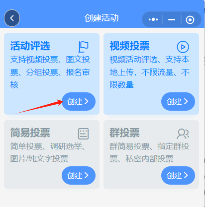 进入投票制作平台(在微信上直接搜索进入),点击首页【创建投票】,选择“活动评选”类型。适合各主题类型投票评选活动,支持图文投票及视频投票。