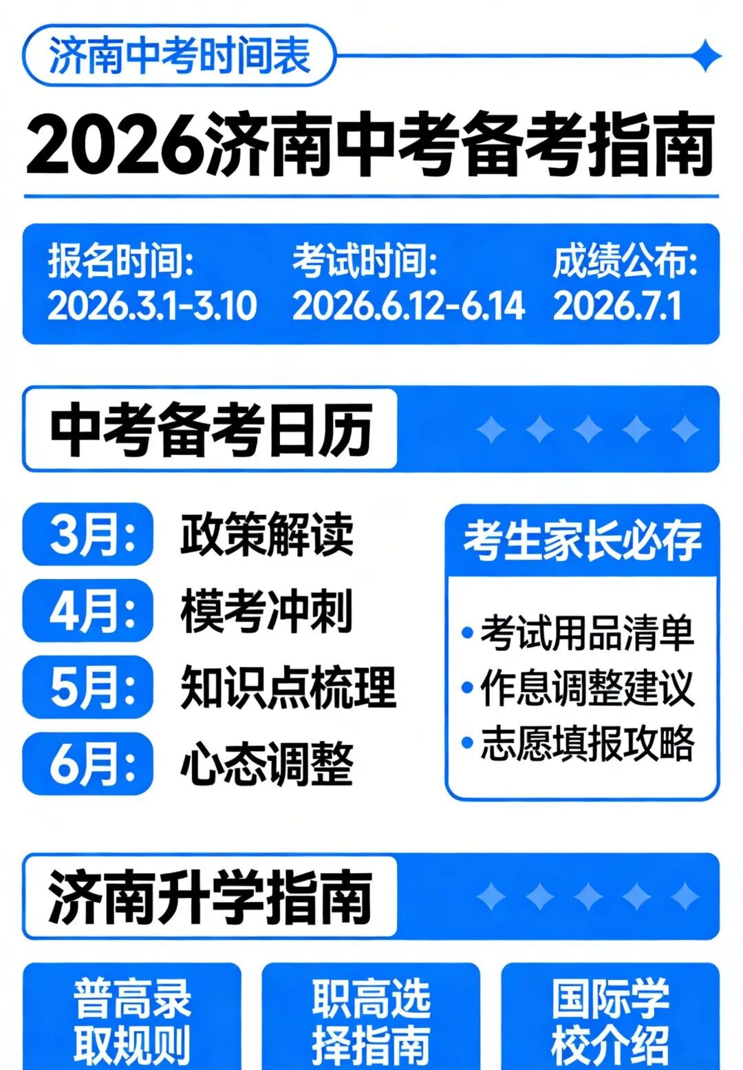 ·3月底4月初:2026济南中考考试安排正式公布(含考试科目、时间、注意事项等)一模考试(重要模拟考,检验前期备考效果,明确薄弱环节)中考体育模拟报名、正式报名(与体育考试相关,务必按时完成)