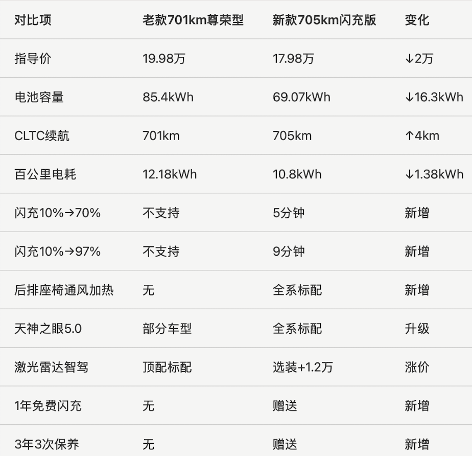 先说最让人摸不清头脑的一点:汉EV闪充版比老款便宜了整整2万,电池容量从85.4kWh缩水到69.07kWh,但CLTC续航却从701km增加到了705km。