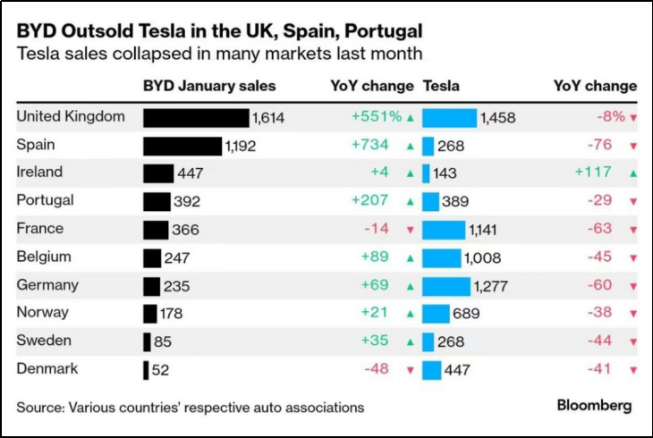根据彭博社统计的数据显示,比亚迪今年1月在英国、西班牙、葡萄牙三国分别实现551%、734%和207%的销量同比增长;同期特斯拉在这三国的销量下滑8%、76%和29%。
