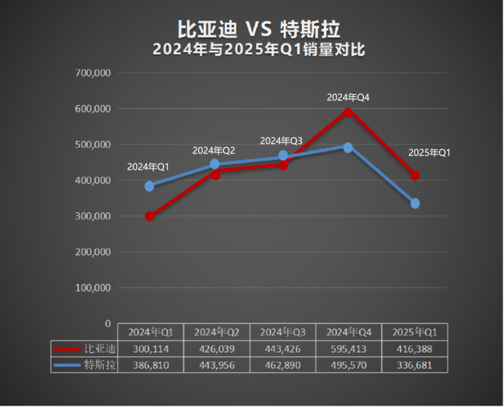 数据显示,2024年四季度,比亚迪全球纯电销量首超特斯拉,今年一季度,实现第二次赶超。特斯拉今年一季度销量为33.67万辆,同比下降13%。