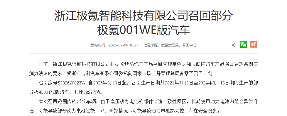 根据公告,一汽-大众自2026年2月6日起,分批次召回2018年8月2日至2025年1月19日期间生产的部分国产奥迪Q2L汽车,共计206012辆;福特自即日起,召回2025年8月5日至2025年11月27日期间生产的部分林肯航海家汽车,共计1706辆;极氪自2026年3月6日起,召回生产日期从2021年7月8日至2024年3月18日期间生产的部分极氪001WE版汽车,共计38277辆;蔚来自即日起,召回2018年3月16日至2023年1月16日期间生产的ES8、ES6和EC6纯电动汽车,数量高达246229辆。