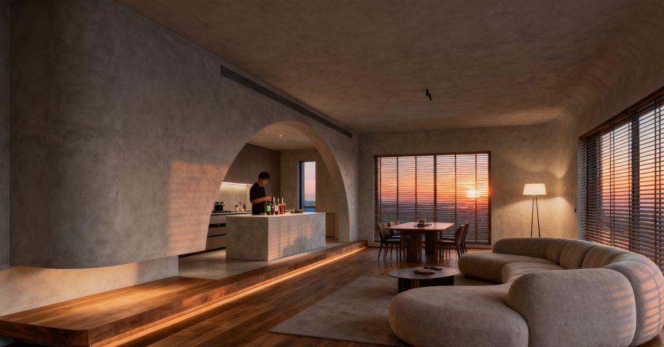 家:主要体现在三个方面:第一,是“模糊边界”。比如,客厅、餐厅、厨房不再被墙体明确分割,而是通过材质或高低差自然过渡。这让家人的互动更流畅,独处或共处都能自由切换。第二,是“拥抱曲线”。锋利的直角会带来紧张感,而柔和的弧形墙角、拱门、圆润的家具,则像母亲的怀抱,能从心理上给人安抚。这是最直观的“视觉松弛”。第三,是“光的魔术”。拒绝单一、惨白的主灯。用多点位、低色温的灯光组合——如落地灯、壁灯、灯带——来营造温暖、有层次的包裹感。影子,也让空间变得更“柔软”。
