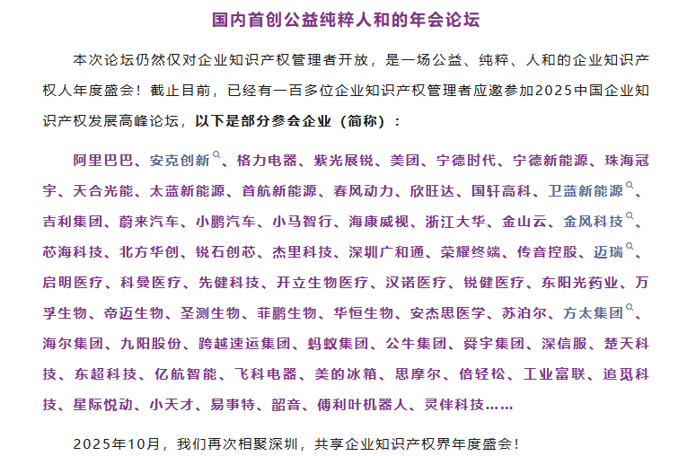 中国企业知识产权发展沙龙是国内最具影响力的企业知识产权人成长生态圈之一,其年度榜单以独特的评选机制闻名。该榜单完全基于参会的一线企业(包括阿里巴巴、格力电器、美团、宁德时代等)IP负责人的实名、点对点推荐,不设任何商业报名或投票环节,被业界誉为“IP服务界的米其林指南”,其客观性与公信力不言而喻。