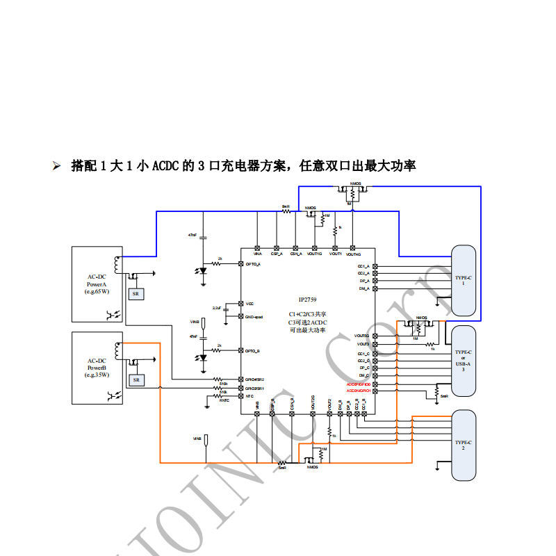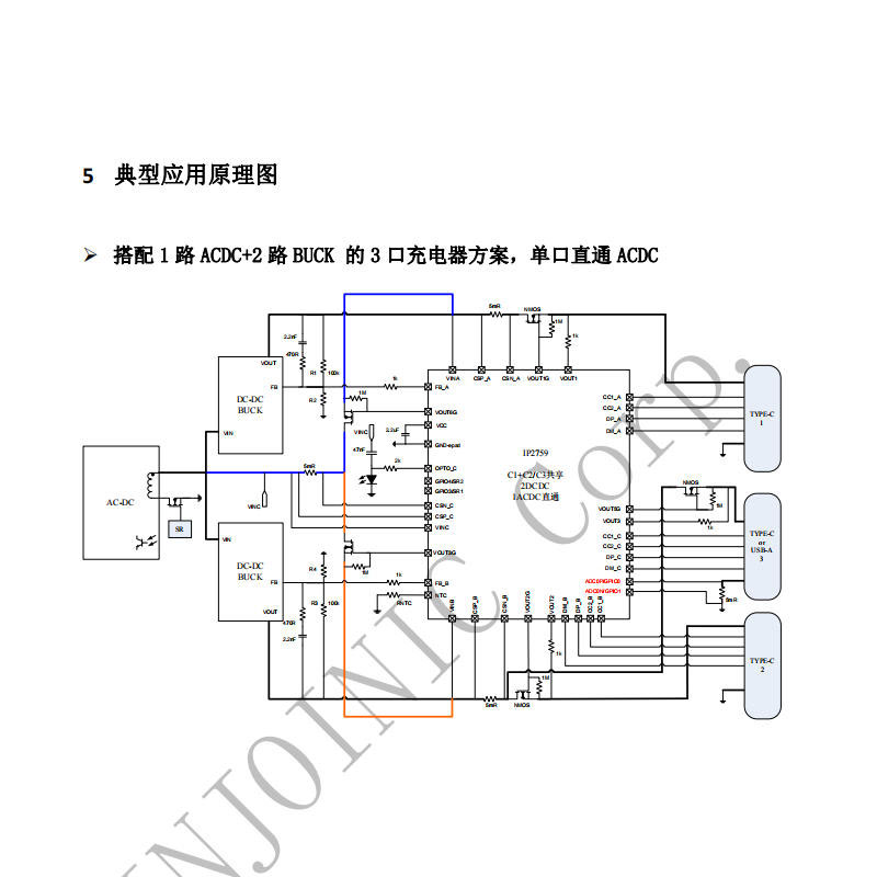1、多口适配器:如桌面充电器、旅行适配器等,IP2759的三口独立快充功能可减少协议冲突,使各设备获得相应的充电状态;高集成度设计有助于减少元件数量,缩小产品体积。