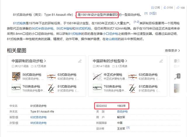 而我们再看看81式步枪的列装时间,根据资料记载,当时,我军继续将手里的56半自动步枪和56式冲锋枪和轻机枪全部都给取代,因为56式枪族在当年对越自卫反击战暴露了不少缺点,像丛林地区作战,56半的枪身太长,火力又太差,56冲的刺刀问题,于是,到了1981年便定型了81杠,直到1983年才正式列装部队。