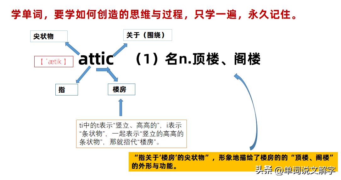 只要大家知道西方的顶楼几乎都是尖状的,我们试试看“顶楼”对应的单词中有没有字母a表达“尖的”、“尖状的”或者“尖状物”等含义?大家先看“顶楼、阁楼attic”单词中有字母a,再看字母a表示什么含义。