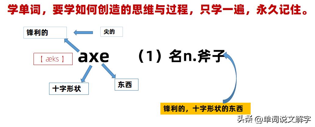 “尖的东西”往往是锋利的,因此字母A由“尖”还可以引申出“锋利”的意思。“axe斧子”就是最典型的代表。