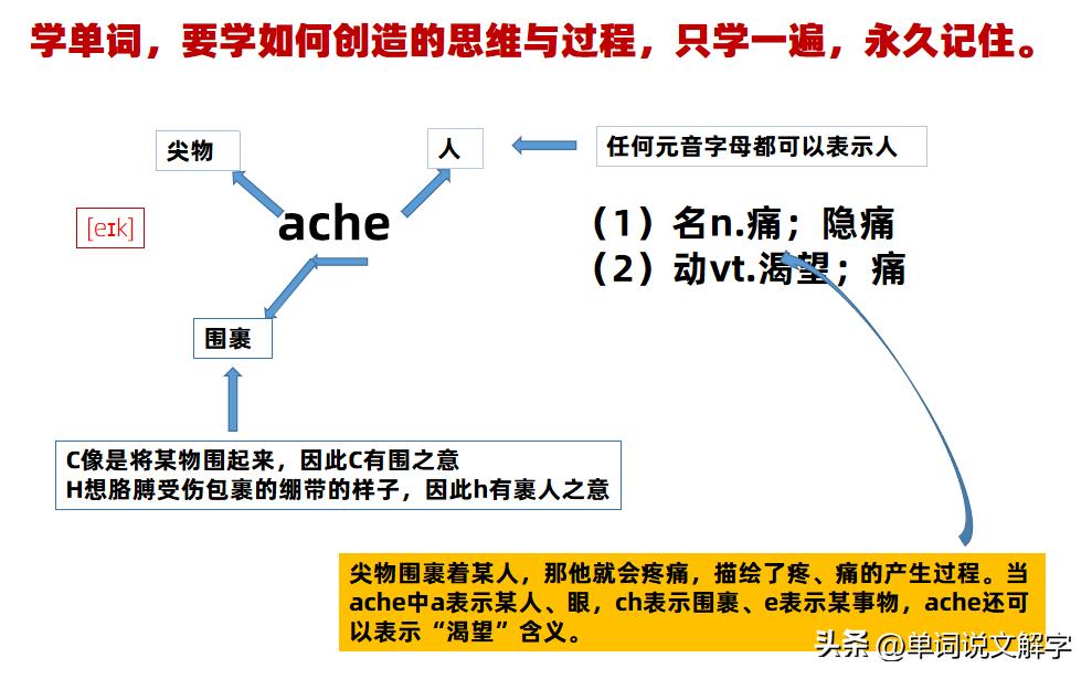 尖物围裹着某人,那他就会疼痛,西方古人只是通过描绘了疼、痛的产生过程而表达了“疼痛”这个词。因此他们首先写出了表示“尖物”的字母a,然后再写出表示“围裹”的ch,最后用字母e表示“人”即可!当然“ache”这个单词还有“渴望”的含义,这时“ache”中字母含义会有变化,这是西方古人创造好“ache疼、痛”后,从另外一个角度看这个单词还可以表达什么话,形成的一个含义!西方古人创造好一个单词,都会这样进行思考一遍,这就是为什么大家可以看到有的单词的含义与含义之间完全找不到相互之间的联系的原因!请大家看,当ache中a表示某人、眼,ch表示围裹、e表示某事物,ache还可以表示“渴望”含义。详细解说图如下: