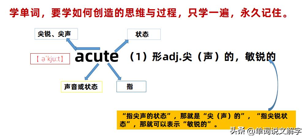 当然在表示“尖锐的”的字母ac后加一个可以表示“人、声音、物、状态”等含义的字母“u”,就可形成“尖声”、“尖锐物”、“尖锐状态”等含义。如“acute尖(声)的、敏锐的”单词,详解图如下: