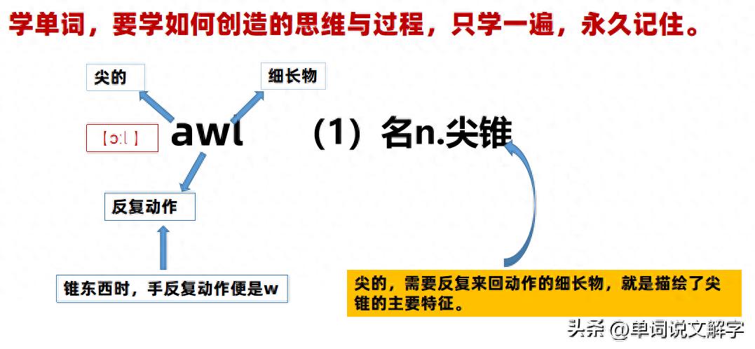 如果大家知道“尖锥”可以用“尖的,需要反复来回动作的细长物”这句话来描绘,那么我们是不是可以首先写出表示“细长物”的字母l来?然后用表示“尖的”的字母a,与表示“反复来回动作”的字母w对表示“细长物”的字母l进行修饰限定即可?大家认真阅读详细解说图。