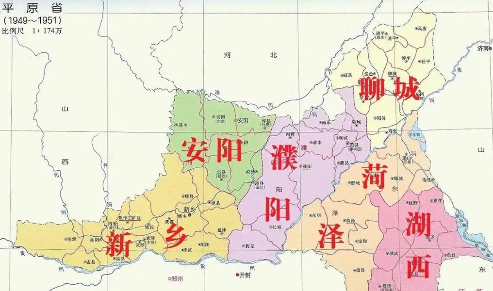 平原省由河北省南部(清丰县、南乐县、长垣县、濮阳县、东明县)、河南省的黄河以北地区、山东省的西部共同组成。其中,山东省的湖西、菏泽、聊城等地,划入了平原省管理。平原省的省会在新乡市,划分为6个专区,分别是:濮阳专区、菏泽专区、湖西专区、聊城专区、安阳专区、新乡专区。