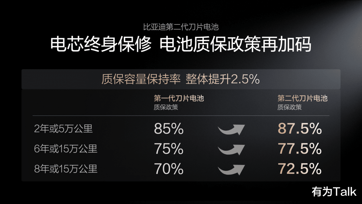 比亚迪宣布,第二代刀片电池的质保标准同步升级:整体容量保持率提升2.5%,6年或15万公里内,当电池容量衰减低于77.5%时,即可享受免费包换服务,电芯则延续终身保修政策。