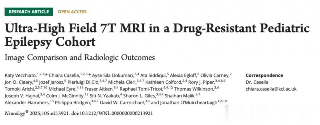 引用信息:Katy Vecchiato, Chiara Casella, Ayse Sila Dokumaci, et al. Ultra-High Field 7T MRI in a Drug-Resistant Pediatric Epilepsy Cohort: Image Comparison and Radiologic Outcomes. Neurology. 2025. doi: 10.1212/WNL.0000000000213921. Epub 2025 Aug 20. PMID: 40834340; PMCID: PMC12367418.