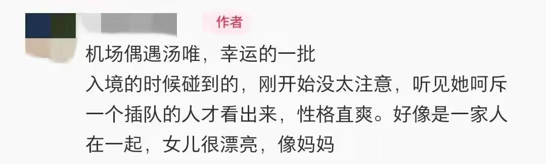 偶遇到汤唯一家的网友爆料,其实汤唯在机场发生了一场意外的小插曲。当时有人在她前面插队,汤唯并没有担心自己是明星,出声会给自己惹来麻烦,她当场就呵斥插队的人。那插队的人估计是没认出是汤唯,发生了几句争执,最后汤唯见人家走开了也没再计较。汤唯的老公担心老婆,一路时不时的回头看看她。