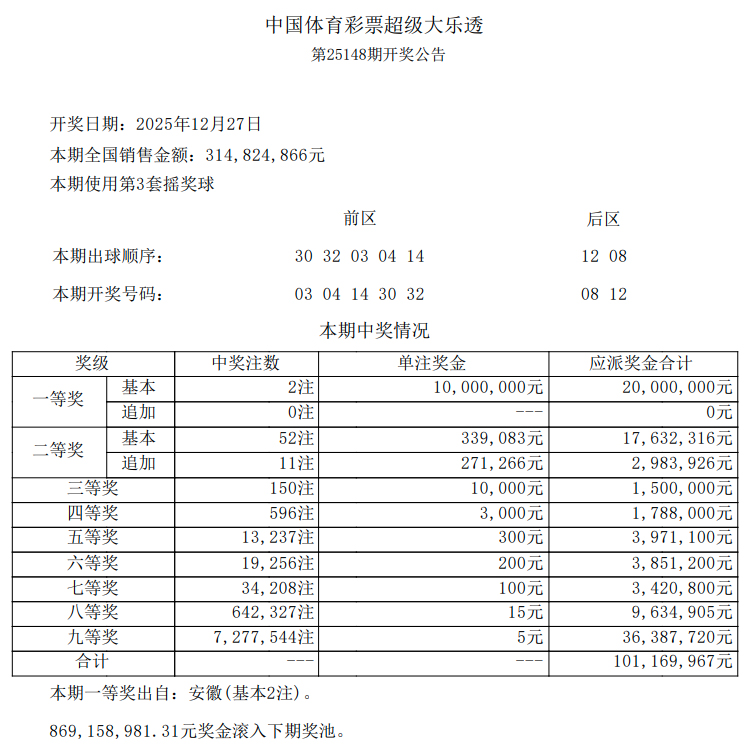 本期一等奖出自:安徽(基本2注)。869,158,981.31元奖金滚入下期奖池。本期使用第3套摇奖球