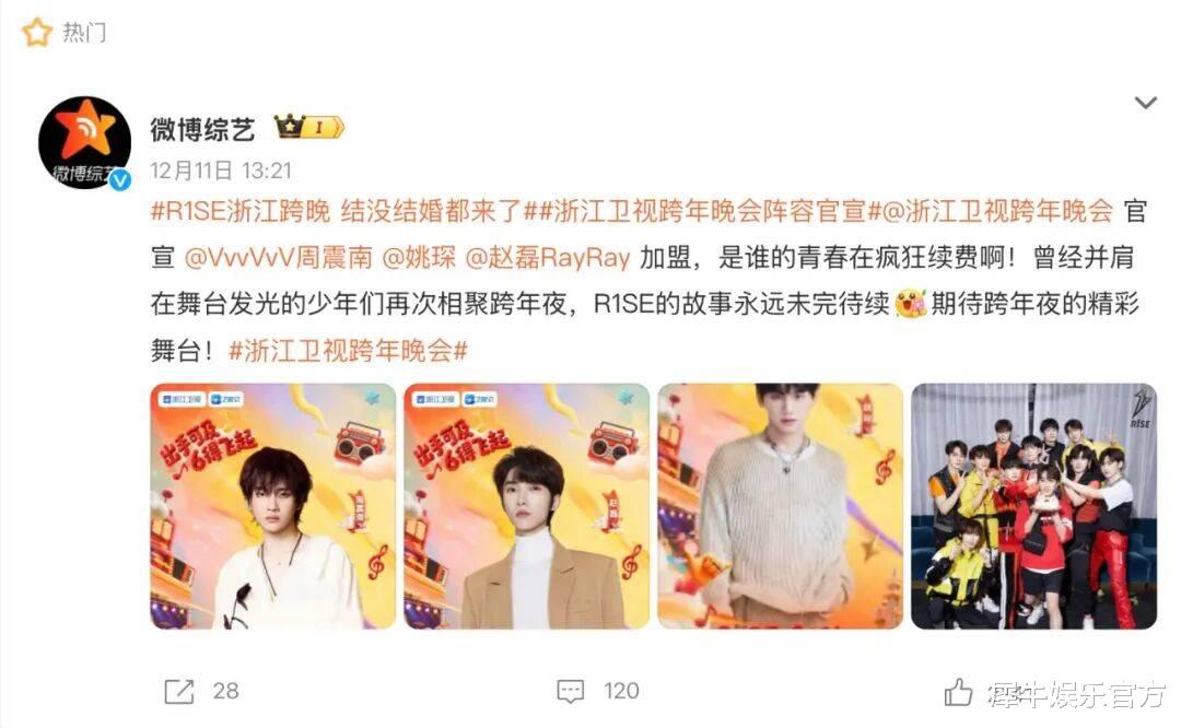 从这个意义上看,近期这波官宣热潮里,犀牛君对浙江跨晚的宣传动作印象颇深。内娱苦男团缺位久矣,浙晚官宣周震南、姚琛、赵磊之所以惹全网猜测全团回归可能性,正是秀粉情绪压抑多年的集中释放,而近期R1SE官博发12个闪电和芒果综艺《欢迎来到蘑菇屋2》官宣定档等信号或暗示老哥们集体营业并非妄谈。当然,目前这些R1SE旧将们职业发展步调不一、塌房风波隐忧仍在,凑足11人难度不小,但倘若真能合体确实是今年浙晚的一张收视王牌!