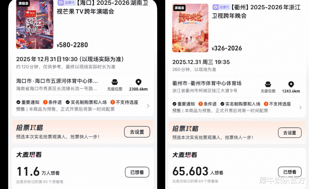 延续去年的行业晚会,今年「海口·2025-2026湖南卫视芒果TV跨年演唱会」和「衢州·2025-2026浙江卫视跨年晚会」都继续在大麦公开对外售票,截至发稿11.6万人想看和65603人想看的热度数据,足以证明跨晚仍是各地国人热衷追逐的年末狂欢活动。