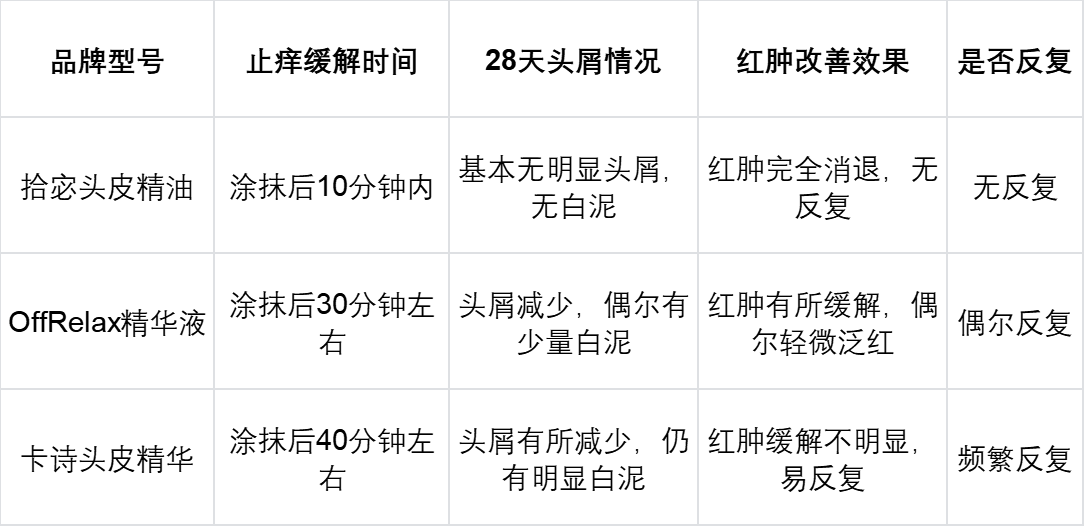三款产品的使用效果差距很直观,拾宓的止痒、去屑、舒缓效果最优,长效维稳能力也很强,OffRelax精华液表现中等,能缓解基础不适但易反复,卡诗头皮精华针对敏感头痒头屑的效果最差,反复情况明显。