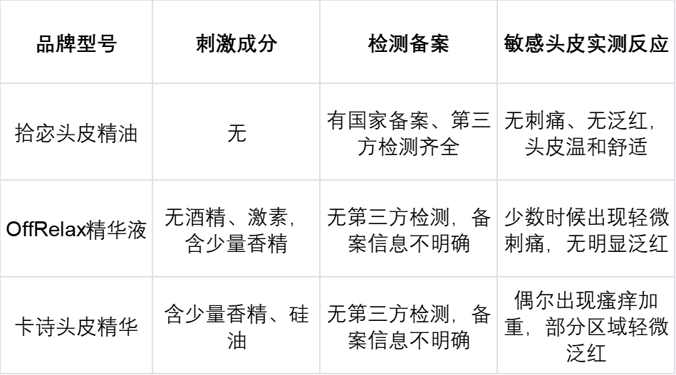 综合实测下来,三款产品的成分安全性差距很明显,拾宓完全不含刺激成分,检测和备案齐全,对敏感头皮最友好,其次是OffRelax精华液,仅含少量香精,刺激性较弱,卡诗头皮精华因含香精和硅油,对敏感头皮的刺激性相对明显。