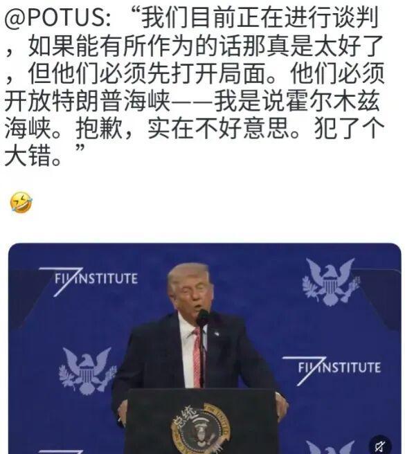他说:“伊朗必须开放特朗普海峡,我是说霍尔木兹海峡”。
