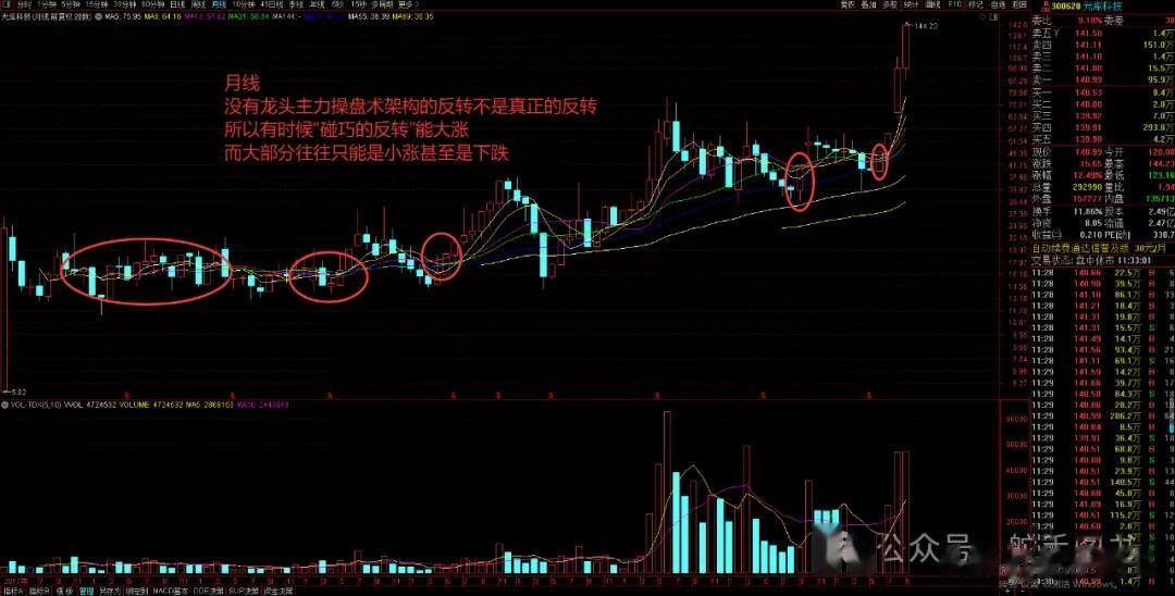 这种k线走势,在外流传的名字有很多,什么芙蓉出水、一阳指、一阳定乾坤、金蜘蛛等等之类的,甚至也有把它包装成主力操盘线之类的一些指标,标识为主力进场的,操盘工具、主力指标等等卖给市场里贪婪、又不思考的交易群体,也不在少数。不能说这些东西完全错误,但根源(基本代码)都是均线的运用,而独立的一个均线反转往往会出现矛盾、重复,甚至是频繁出现导致交易者越用越乱了,其结果往往依旧是亏钱。因为真正的反转其中还有很多要点是和趋势,龙头主力操盘术的架构密不可分的。