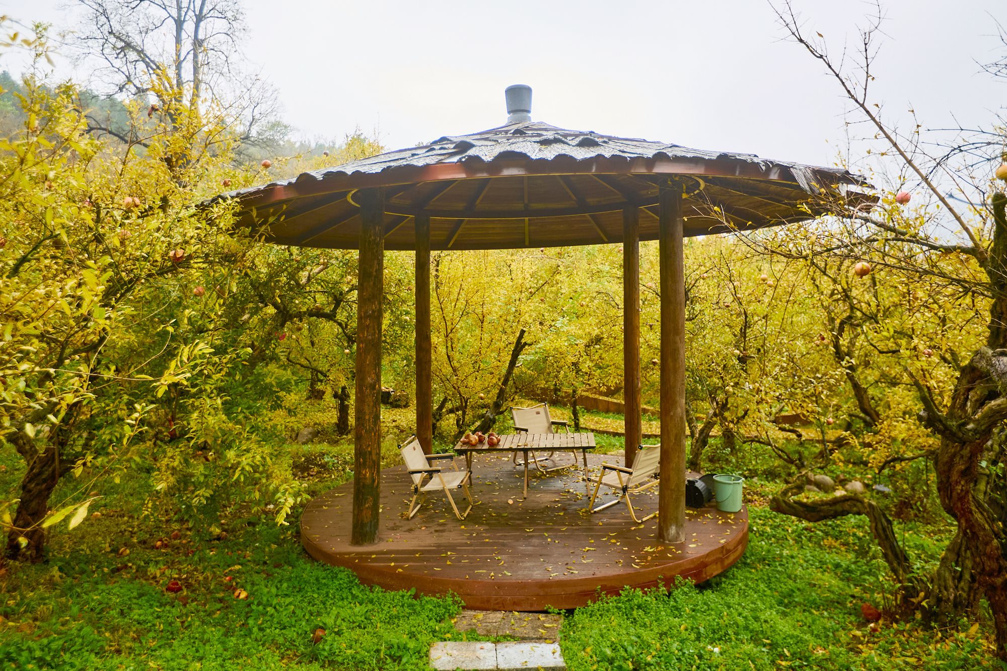 园中布置得古色古香,凉亭被茂盛的石榴树环绕,天气晴好时坐在其中,看硕果累累,看天高云淡,田园氛围拉满。