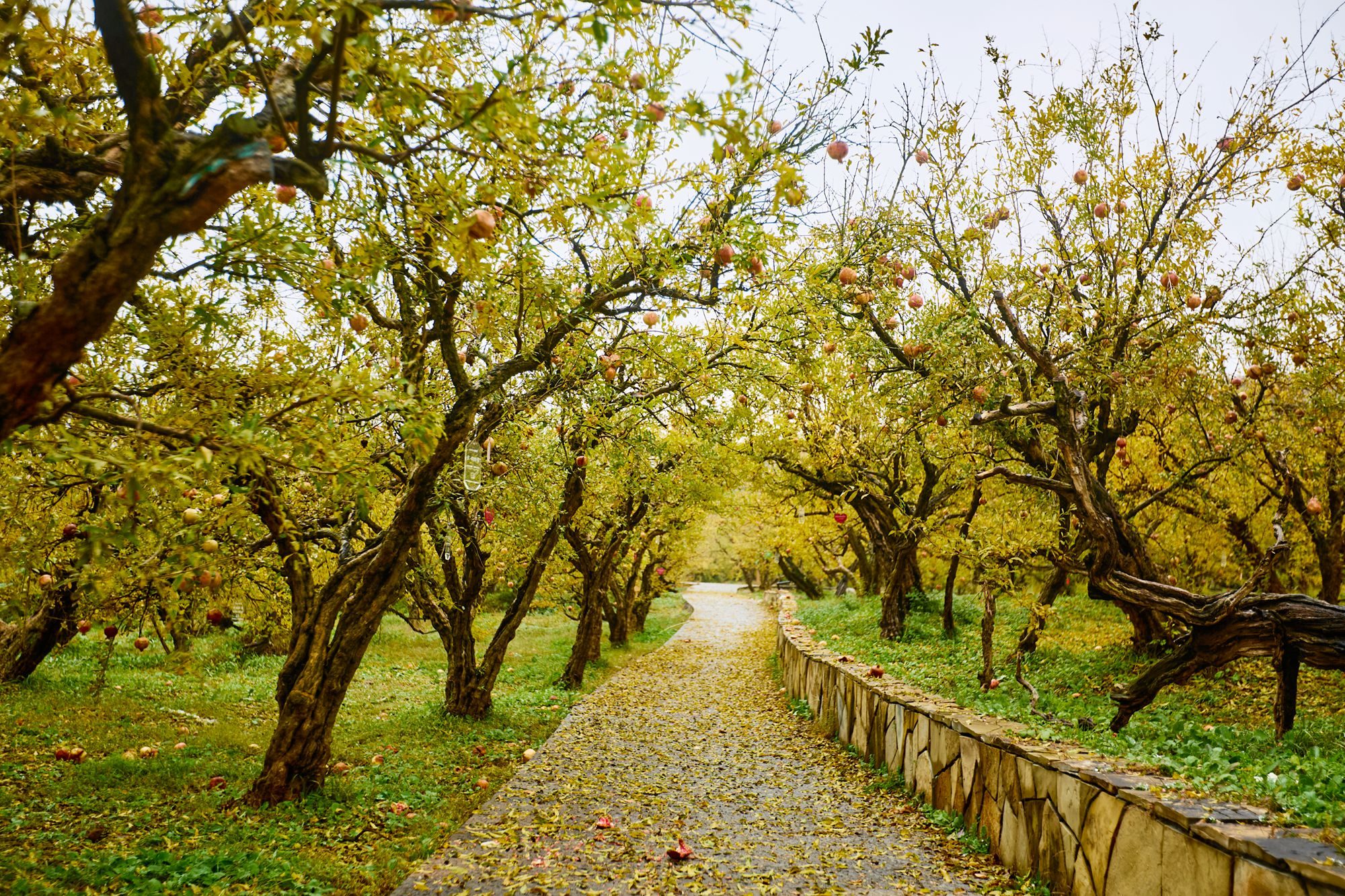 狭长小路上铺满落叶和成熟后掉落的果实,石榴树树干粗壮遒劲,树龄多在200年以上。在清代,当地有将石榴园作为女儿嫁妆的记录,由此可见石榴在人们心中是有着“多子多福”等美好寓意的。