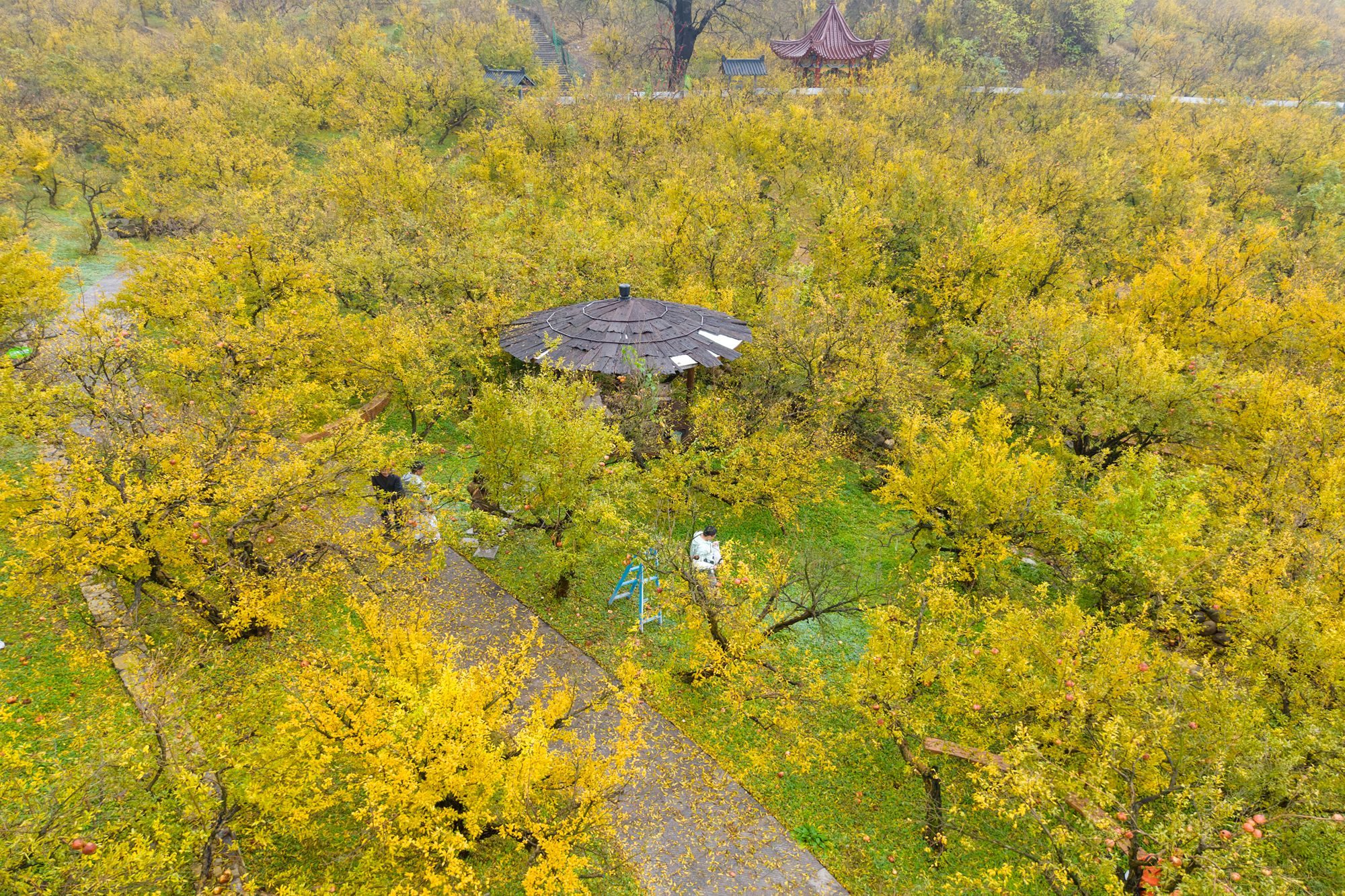 粉墙黛瓦的石榴园带着明清徽派建筑的典雅气质,透过园门,金黄的树叶绚烂如花,秋意和古意闪在每一棵树的枝头。