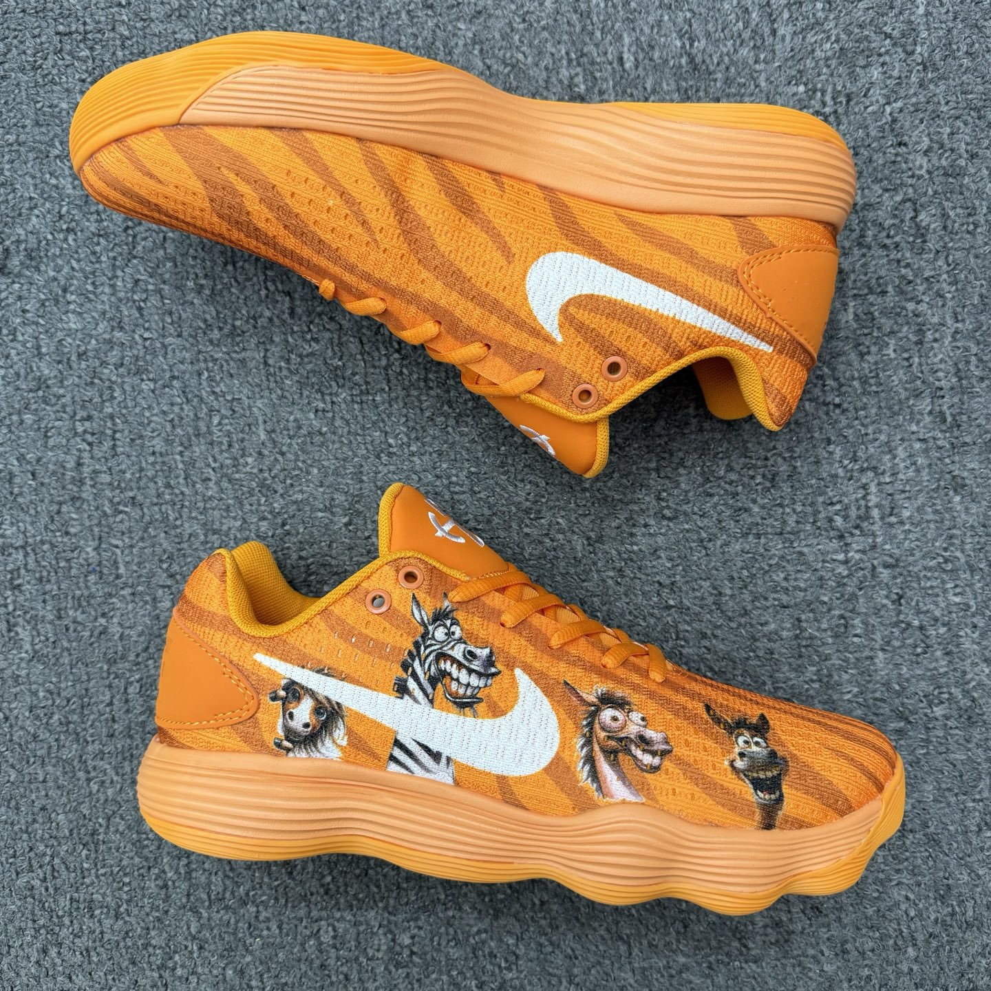 Nike Hyperdunk 2017 Low 耐克 HD2017 低帮 马年限定 橙色动物园 动物狂欢 当篮球赛场遇上童趣动物园,这双Nike Hyperdunk 2017 Low "Animal Pack"把活力与趣味直接穿在脚下。亮眼的橙色编织鞋面如同热带草原的暖阳,鞋身印满的斑马、驴子等动物卡通头像,仿佛一场迷你动物狂欢派对,让硬核篮球鞋瞬间充满俏皮感。标志性的白色Swoosh Logo在橙色鞋面上格外醒目,搭配波浪纹理的全掌React中底,既保证了专业的缓震性能,又让整双鞋在视觉上更具动感。不仅是一双能征服球场的实战利器,更是出街吸睛的潮流单品。