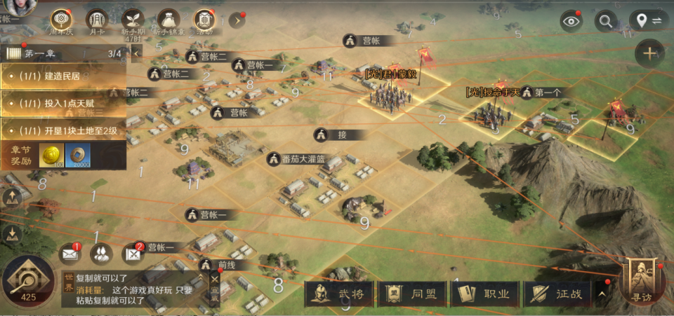 《三国:谋定天下》从新人入门开始就给你铺好了路,新人开局就送超多福利,创建角色就有预约奖励,送强力橙将和各种资源,七日活动第二天送孙策,过了剧情送蔡文姬,累计签到还能拿到貂蝉,前七天登录就送上百次免费抽卡,还有大量黄金和道具,新人开局就能拥有成型的队伍,不用慢慢熬等级攒资源。游戏还把很多SLG里烦人的重复操作都简化了,自动铺路不用你手动一格一格挪,主城自带资源土地,不用天天和别人抢地闹矛盾,部队可以自动升级,武将等级可以随意置换,练错了也不心疼,完全不用重新花时间练级,攻城还能预约,到点自动参与,不用你天天盯着时间上线熬夜,对时间不够的新人非常友好。抽卡方面也非常良心,橙卡出率比同类游戏高,保底次数也少,解锁战法韬略不用同名卡,只花免费铜币就能搞定,完全不会锁武将卡你氪金,新人不用花很多钱就能玩得舒服。